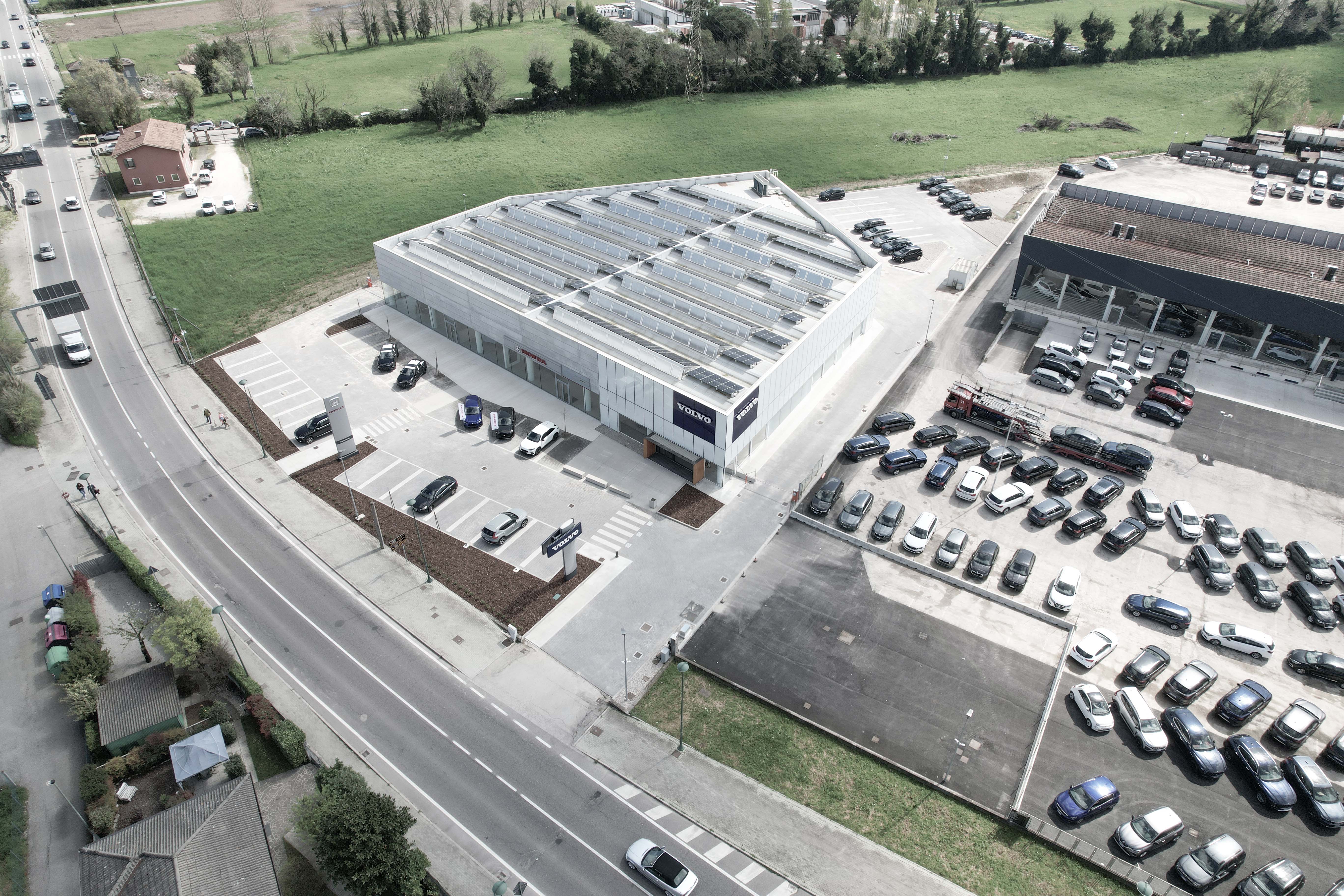 Progetto di un nuovo volume commerciale per concessionarie auto, articolato tra showroom, uffici e spazi tecnici.